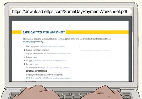 Try same-day wire service for larger payments. If your payment to the IRS is too large to go through EFW or Direct Pay, you can set up a same-day wire with your financial institution to send the money to the IRS. Contact your financial institution ahead of time and make sure same-day wire service is available. To order a same-day wire transfer, you'll need to fill out the same-day taxpayer worksheet, available at https://download.eftps.com/SameDayPaymentWorksheet.pdf, and give it to a banker at your financial institution.