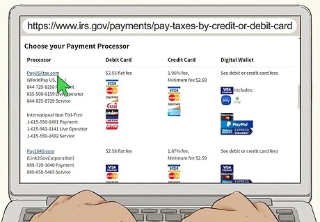 Go through an online service provider to pay with a credit or debit card. You can also pay the IRS online with a credit or debit card, although the IRS does not accept credit or debit cards directly. Instead, you'll have to go through one of the service providers listed at https://www.irs.gov/payments/pay-taxes-by-credit-or-debit-card. These service providers each charge a fee. In addition, your credit or debit card may also charge a fee.