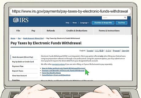 Submit your payment through Electronic Funds Withdrawal (EFW) if you e-file your taxes. The EFW service is only available for taxpayers who submit their returns using tax preparation services, or through a tax professional. This option allows your tax payment to be direct-debited from your US bank account. The IRS doesn't charge any fees to use EFW. Check with your financial institution to make sure it doesn't charge any fees either.