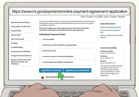 Submit your application for an installment agreement online. If you aren't able to pay your full tax bill all at once, you may qualify to pay in monthly installments instead. To start an application, go to https://www.irs.gov/payments/online-payment-agreement-application and click on the button that says "Apply/Revise as Individual." Whether you qualify depends on your specific tax situation. Generally, you qualify if you owe less than $100,000 in combined tax, penalties, and interest. To apply for an installment agreement, you will need to provide your name and address exactly as it appeared on your previous tax return along with your SSN or TIN (Taxpayer Identification Number).