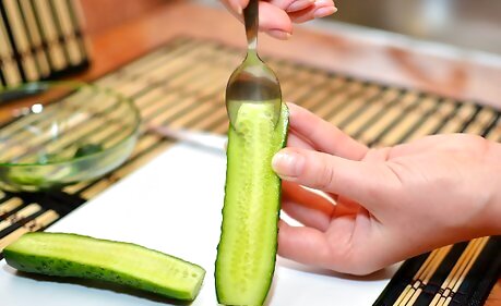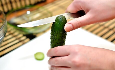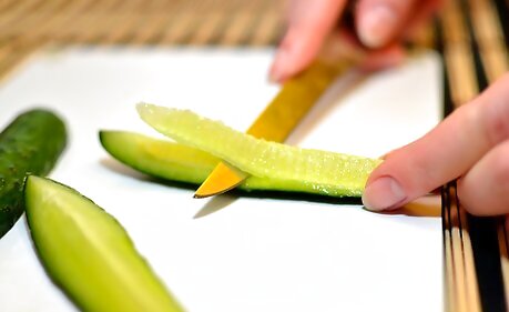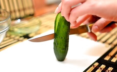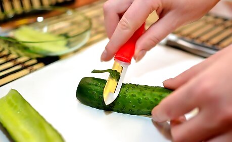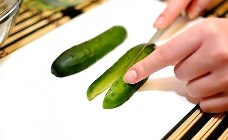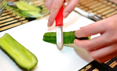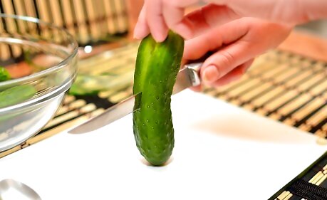 Pick up your cucumber section in your non-dominant hand. Use your dominant hand to position the paring knife or vegetable peeler on the part of the peel closest to your body. Point the blade of the knife away from you.