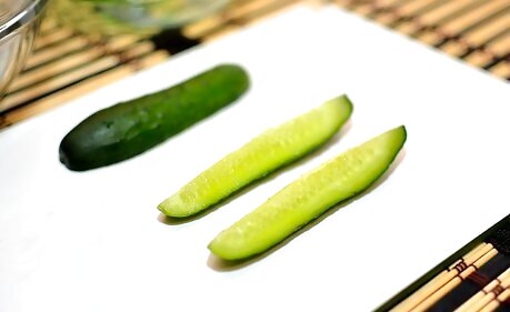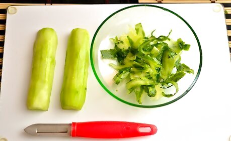 Slice away the peel in long strips, taking care not to cut too deeply into the flesh. Slice so that the knife moves away from your body. Sometimes the cucumber can be tender and peeling its skin after cutting will be hard, so make sure to peel the skin and then cut it and remove its seeds!