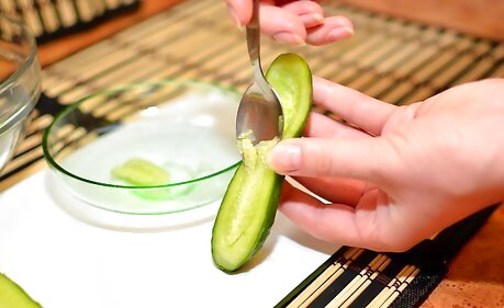 Scoop out the seeds using the tip of a spoon. Using a butter knife is also a best way to remove the seeds from the cucumber.