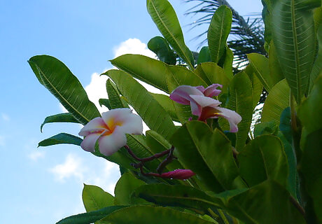 Choose radiant and powerful color flowers. Try look for plumerias that just blossomed. These are the ones that are vibrant in color and have curls in the petals. If you are looking at white plumerias, good flowers have that "splash" of yellow in the center.