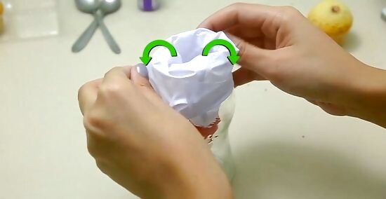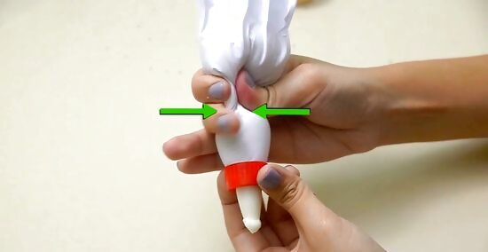 Twist the top end of the bag. Twist and hold the top end of the bag so you can squeeze it without frosting flying out the top. Try to twist right above the frosting to minimize the amount of air that might get mixed into it. You're now ready to move on to the decorating. For greater convenience, use a rubber band to tie it shut.