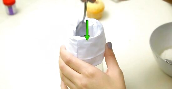 Place your piping bag in your cup or mug. Put the bag nozzle-side down into a tall cylindrical container. This will steady the bag while you fill it with frosting. If you're using a plastic or canvas bag, you can fold down the edges outward for easier access to the base of the bag. See the Tips section for a less messy method of filling your pastry bag using plastic wrap.