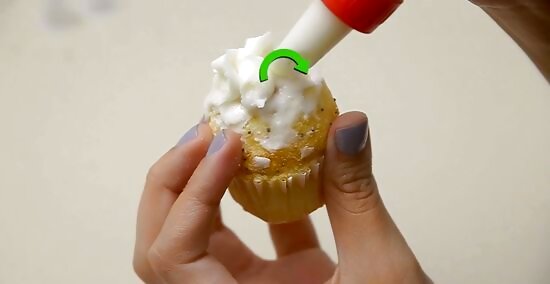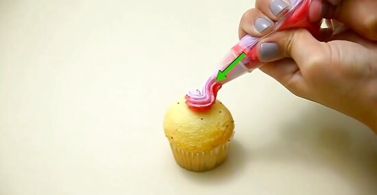 Stop squeezing and gently lift the bag. It's important to release all pressure from the bag before lifting it from the cupcake. If you stop squeezing, then lift the bag in a vertical line, your swirl will end with an attractive decoration. This will be a star shape of some kind for most piping tips, or a small point for simple, round piping tips.