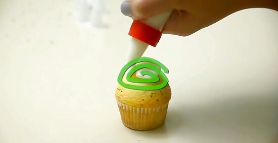 Use a French tip nozzle to create a quick and unique design. A French or French swirl piping tip design deploys the frosting in high, thin ridges. You can hold the bag still above the center of the cupcake, then squeeze as you watch the frosting spread evenly outward on top of the cupcake. This technique works best on small cupcakes, since the frosting won't spread out evenly past a certain distance.