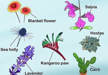 Account for personal taste. Low water plants range from grasses to cacti, flowering shrubs, and more. Look at different plants in a garden catalog or online. You can also visit a local greenhouse or garden store to see plants up close. Plant the ones that are most satisfying to you. A few common choices are: Blanket flower Sea holly Lavender Salvia Kangaroo paw Cacti Hostas