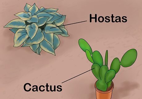 Choose plants native to your region. Different types of plants do well in different climates. If you live in a dry, arid climate, you want to plant things from similar climates. The same holds true if you live in a wetter, cooler climate. Plants that are native to your area are always a good place to start when considering what will grow in your climate. For example, you wouldn’t plant a cactus in marshlands, but it would do really well in a desert climate. Other low water plants, such as hostas, will do well in drier climates.
