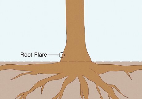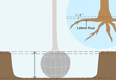 Dig the hole to the same depth as the root ball. Locate the first lateral roots, which are the long offshoots near the top of the root ball. For proper placement, the lateral roots need to be 1–2 in (2.5–5.1 cm) under the soil’s surface after planting. The start of the tree trunk should be about level with the ground. If you plant too deep, the roots will struggle to get oxygen and eventually smother. Water may also pool around the base of the tree, causing the bark to deteriorate, which eventually kills the tree.