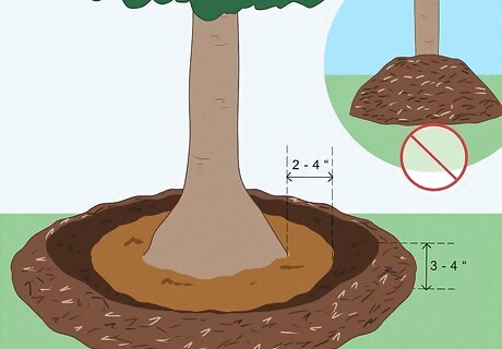 Add a 3–4 in (7.6–10.2 cm) layer of organic wood mulch around the tree. You don’t have to mulch immediately after planting, but try to do it fairly soon to reap the protective benefits. Don’t pile mulch up around the tree trunk—leave a 2–4 in (5.1–10.2 cm) space between the trunk and the mulch. If you're planting in the fall, mulch before the first freeze. If you're planting in the spring, mulch before summer. Organic wood mulch helps the soil retain moisture and regulate temperature. It also prevents weeds from sprouting up and stealing the tree's nutrients.