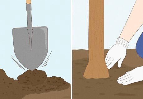 Dig a hole 2-3 times the diameter of the root ball. You’ll be using the original soil to fill in the hole around the root ball, so shovel the excavated soil right next to the hole. For easy backfilling, it can help to lay down a tarp and shovel the soil on top of it. A regular shovel will work fine since you’ve already moistened the soil. You don’t need to literally measure the root ball (unless you want to). Just make sure the width of the hole can easily accommodate the roots.