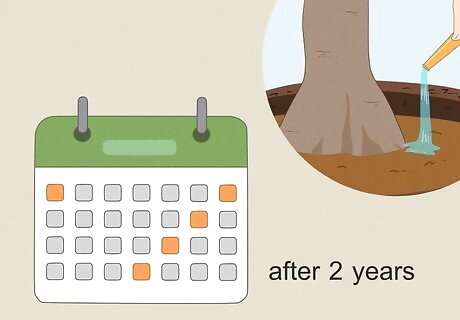 Water less frequently once the tree is established. After about 2 years, you can ease up on the watering. The specific amount of water needed still depends on your climate, but in general, water an established tree deeply every 3-5 days during the growing season (late spring through early fall). In the dormant season (late fall through early spring), water once a month.