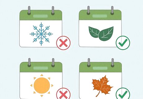Plant most tree species in the fall or early spring. Cool weather is the best time for planting since the trees are dormant during that time. Planting a tree in late spring or summer, when the roots are actively growing, puts too much stress on the tree and it may not survive. Early fall is best for container trees and balled and burlapped (B&B) trees. Spring is best for bare root trees (trees that have been stored without any soil around their roots). Always plant before the first freeze (or after the last freeze).