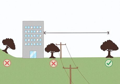 Pick an open, flat area away from buildings, powerlines, and utilities. Make sure there's plenty of room for the tree to grow to maturity. In the United States, you can call 811 before you dig. Someone will come out to mark your underground utility lines for free (or walk you through it over the phone) so you can avoid planting too close to them. Most urban communities have zoning laws about trees and digging holes. To avoid fines, check local laws before you plant. If you live outside the city limits, you can plant without restrictions.