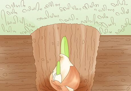 Plant the bulb with the tip pointed upwards. Bulbs generally have an oval shape, similar to an egg. The smaller, more pointed end is the tip. This part should point straight up towards the sky. Set the rounded end in the soil. If you are unsure which side is the top, plant the bulb on its side. It will still grow towards the soil’s surface.