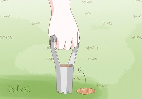 Dig holes for each bulb with a bulb planter. A bulb planter is a handy tool that creates holes without destroying your yard. You can get a bulb planter online or at a gardening center. Push the planter into the grass, then lift it to remove a plug of soil. It’s a very easy and effective way to plant batches of bulbs. You can also make holes with a small trowel, a garden fork, or a metal spike. A spade can also be used to make a planting bed. Push the spade down underneath the sod, then carefully roll the sod away to reveal the soil.