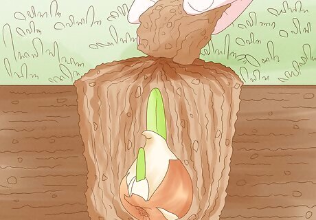 Cover the bulb with the soil. If you used a bulb planter, you removed a small plug of soil you can set back in place now. Otherwise, push any loose soil over the bulb. Lay out any sod you rolled up earlier. Make sure the bulb is completely covered by sod or soil. Press down gently on the planting area to pack the dirt more firmly into the ground. Use your foot, a shovel, or a trowel. If you notice any gaps in the sod, you can fill them in with compost.