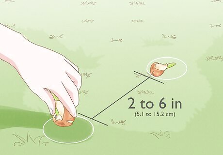 Scatter the bulbs 2 to 6 in (5.1 to 15.2 cm) apart. Bulbs need a little space so they get enough resources and have room to grow. Spread them out over a grassy area in your yard. Keep the bulbs confined to as small of a space as possible so the flowers cluster together, making their color stand out once they bloom. Read the bulb packet to find out how far to spread them. Larger bulbs like daffodils need to be spread further than smaller bulbs like crocuses. The bulbs don’t have to be grown in a straight line. It’s often better to scatter them out a little haphazardly so they look more natural in the grass. Some gardeners toss the bulbs into the air and plant them where they land.