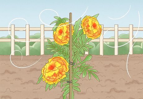 Stake them in windy environments. If the place you live in experiences a lot of wind, stake your plants. Take a thin stake or stick that is slightly shorter than your marigold plant and use plastic ties to loop the plant to the stake. The stake will keep the plant upright and will allow it to survive harsh weather and storms.
