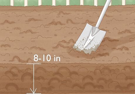 Dig about 8–10 inches (20–25 cm) into the soil. Use a trowel or shovel to dig into the soil 8–10 inches (20.3–25.4 cm). Turn the soil over to break it up and to make it airy. Do this for the entire area in which you will be planting the seeds. As you are turning over the soil, make sure to break up any clumps and remove any rocks or pebbles you find.