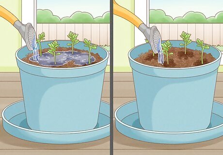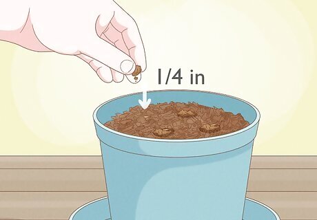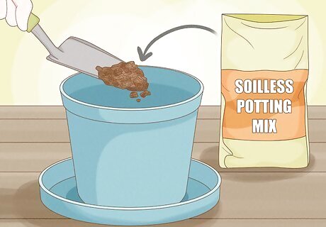 Use a soilless potting mix for indoor containers. Use a pot filled with soilless/seed-starting potting mix. Soilless potting mix is made up of materials like peat and bark. You can find it at gardening stores or stores like Home Depot and Lowe’s. Make sure the pot you are using has drainage holes in the bottom. This will allow water to pass through the pot naturally as it does in the ground. You may want to put a board or plate underneath the pot to catch any excess water or soil that comes out of the drainage holes.