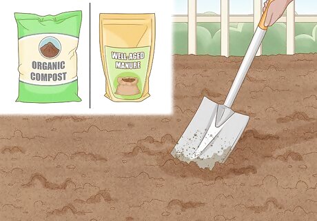 Lay down compost or manure. Before you plant marigolds, mix some organic compost or well-aged manure into the garden soil. This will improve the health of the marigolds by giving them the nutrients they need to thrive.