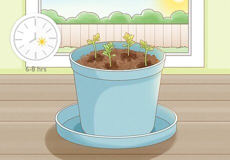 Place the plant in direct light once germination begins. Your marigold plant should start sprouting within 5-7 days. Once the plant has started sprouting, you will want to place it in direct light for at least 6-8 hours everyday. Either place the pot by a window if you live in a sunny climate, or put the pot under a grow lamp. If you are growing marigolds in a pot outdoors, keep them in direct sunlight.