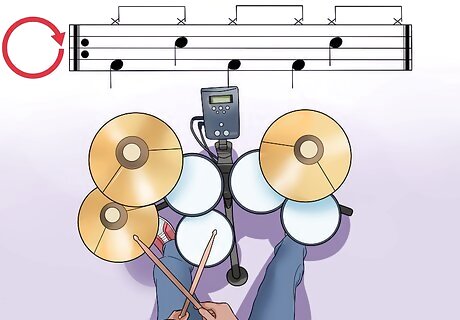 Keep time with either the hi-hats, bass drum(s), both, or none. Not all drum solos need to keep time throughout, and many will flicker in and out of keeping time. But for beginners keeping one hand or foot as a metronome is a great way to stay grounded while you explore the kit. It may be a good idea to use different foot patterns, tempos, and time signatures throughout your solo, but this can only happen once you've established the song's "normal" rhythm.[[Image:Play a Good Drum Solo Step 3.jpg|center]