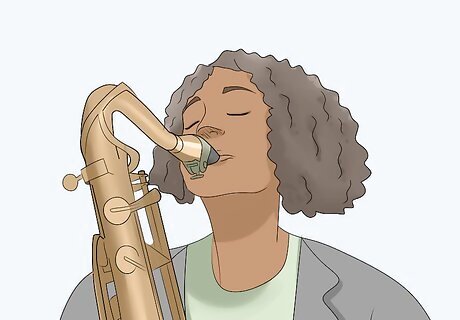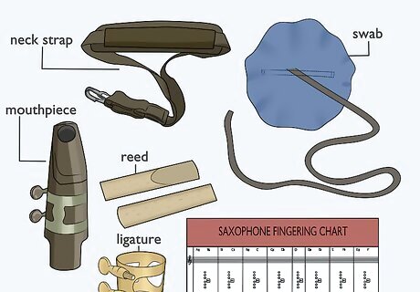 Obtain a decent saxophone and the accessories needed to play it. You may be able to borrow one from a school for a small fee, rent one from a local music store, or buy a used one. If you're using a particularly used or old instrument, you may want to have a music store technician look it over to make sure it's in good shape for playing. In addition, you'll need to borrow or purchase the following. A mouthpiece, if one doesn't already come with the instrument. Don't buy the cheapest one available, but don't splurge on a professional one yet, especially if you may not even stick with an instrument. You'll probably want one made of plastic or hard rubber. A ligature, if not included with the horn. A metal one is fine, or you can spend a little extra for a leather one, which is more durable and produces a better sound. Reeds: As a beginner, you'll want to start with strength 1.5 to 3 reeds and experiment to find a strength that produces the best effect with the least amount of effort. Good brands to start with are Rico and Vandoren. Neck strap: Tenor saxophones are heavy, and impossible to play without additional support. You can purchase a relatively cheap and comfy neck strap at almost any music store. Swab: Something as big as a tenor sax collects a lot of moisture when played. A swab is a piece of fabric (often silk) on a long string with a weight on the end that is pulled through the instrument to clean it. Fingering chart: A fingering chart shows how to play all the notes in the range of the instrument, and you'll want to have one when learning to play. Method book(s): While not required by any means, if you're learning on your own or would like some extra help, they are an excellent investment.