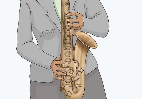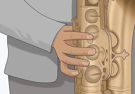 Make sure you're holding the instrument correctly. Your left hand should be on the top and your right hand should be on the bottom. Your right thumb goes under the curved thumb rest towards the bottom of the instrument. Your right index, middle, and ring fingers go on the mother of pearl keys that should be easy to find. Your pinky will move the other keys at the bottom of the sax. Your left thumb should go on the round piece at the top of the instrument. You will see five mother of pearl keys at the top. Your index finger goes on the second one down, and your middle and ring fingers go on the fourth and fifth, respectively. Do not put any fingers on the tiny key, for this is only used in certain notes.