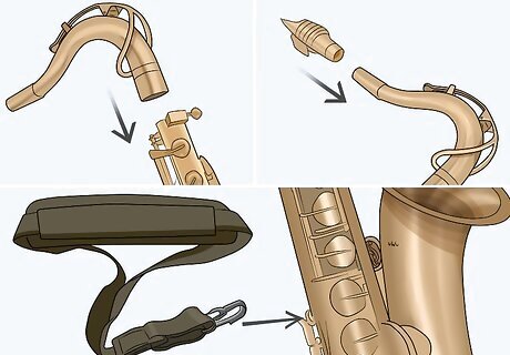Assemble the saxophone. Attach the gooseneck (the short, curved metal piece - the curve is unique to the tenor sax) to the top of the body of the instrument and secure with the neck screw. Place the ligature on the mouthpiece and slide the reed under the ligature, securing it with the ligature screws. Attach your neck strap to the hook on the back of the instrument, put it around your neck, and stand up.