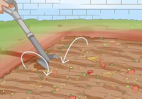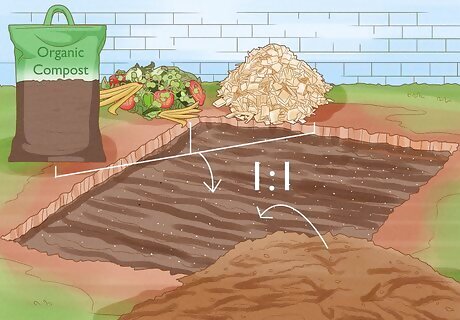 Add organic matter to the soil at a ratio of 1:1. This means, try to add as much organic matter as you can so the top layer of your garden is half the soil that was already there and half added organic matter. Organic matter can include shredded brown and green leaves, horse manure, wood chips, or compost, such as fruit and vegetable scraps. You don’t not need to add organic matter to the entire 12-18 inches you previously dug, but add it to the top 6-8 inches. Do not add meat, fish, or dairy as organic matter into the soil. Likewise, if you choose to maintain a compost bin or pile, never add these types of scraps to it.