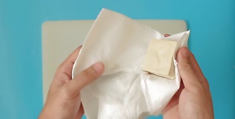 Wrap the tofu in paper or clean cloth towels. Cover the entire tofu block in paper or cloth towels to absorb excess water while it drains. After wrapping the tofu block, press it firmly with your hands over the sink to get rid of water dripping from the tofu. If you use paper towels, you will have to change the towels every 30 minutes while draining the tofu.