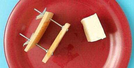 Weigh the tofu down with a cutting board and heavy objects. Set the tofu down on a plate or shallow bowl and place the cutting board on top. Set a pot, book, or weighted object on top of the cutting board to slowly press water out of the tofu. Choose an object at least as long and wide as the tofu block to weigh it down evenly.