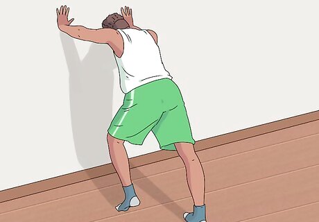 Do calf stretches with your hands against a wall. Face the wall, lean slightly forward, extend your arms, and place your palms flat against the wall at shoulder height. Take a half step forward with your left leg, keep the knee bent slightly, and keep your left foot flat on the floor. Slide your right foot slightly back so that you can extend it fully but comfortably keep your right foot flat on the floor. Once you’ve gotten in the proper position, lean your upper body a bit more toward the wall until you feel your right calf stretching slightly. Keep both feet flat on the floor. Hold the stretch for 15-30 seconds. Then, return to the starting position and bend your right knee slightly until your feel your calf stretching again. Keep your feet flat on the floor and hold this stretch for 15-30 seconds. After that, switch the positioning of your legs and repeat the stretches. Instead of leaning against a wall, you can lay your palms flat on the edge of a sturdy table.