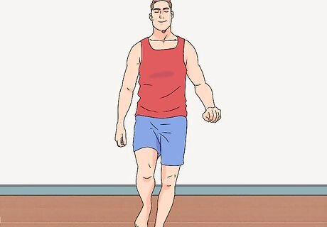 Start by balancing on each leg with your eyes open. Stand up straight with your feet facing forward and shoulder width apart. Raise one of your feet so that your lower leg is parallel to the floor, or as close to parallel as you can manage. Hold the pose for 30-60 seconds, then return to the starting position and switch legs. Focus your eyes on a stationary object, like a poster on the wall or a nearby exercise machine. To aid your balance, hold your arms straight ahead or straight to your sides, palms down. If you need extra help, place one hand on a nearby table, countertop, or similar sturdy object. Do this pose 2-3 times on each leg per workout. Aim to do balance training workouts at least 3 times per week. Balance training is known as proprioception. Your body’s joints—and your ankle joints in particular here—will make constant adjustments to keep you balanced, strengthening them in the process.