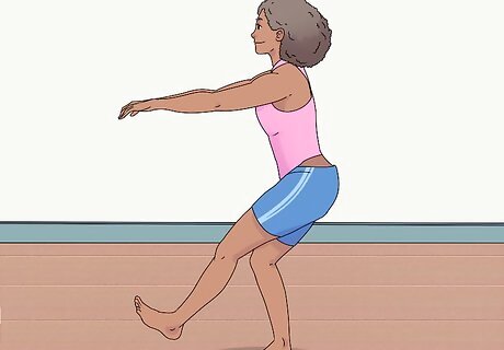 Move on to trying one-legged half-squats with your eyes open. After you’ve mastered balancing for 60 seconds with your eyes closed, go back to keeping your eyes open. This time though, dip down slightly by bending the knee of your leg that’s still on the floor—aim to drop down about 6–12 in (15–30 cm). Hold this “half-squat” for 1 second, then return to the one-leg balance position and repeat. Do 10 half-squats on one leg, then switch to the other. Do 2-3 sets of 10 reps each for each leg. Hold your arms straight ahead with your palms down to aid your balance. If you need additional support when starting out, grasp one or both hands on the back of a sturdy chair.