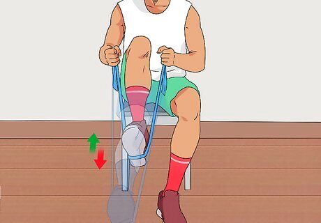 Do seated pedal-pushes with a resistance band. Sit in a chair, loop the resistance band around your foot just behind your toes, and hold the ends of the band in your hands. Touch your heel to the floor, keep the rest of your foot angled upward, and hold the band taut. Press down against the resistance of the band for 1 second, as if you’re pressing the accelerator pedal of a car. Do 3 sets of 10 reps per foot. You can buy elastic resistance bands at any fitness supply retailer. Different bands have different resistance levels, so start with a lower resistance and work your way up as your ankle strength increases.
