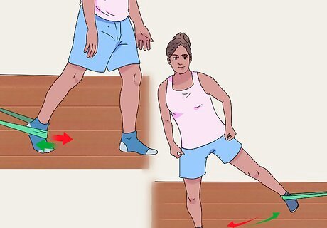 Try forward, back, and side-to-side leg kicks with your resistance band. Loop the band around the leg of a sturdy table, then tie the ends of the band around your left ankle. Stand with the outside of your left ankle facing the table leg, far enough away so that the resistance band is taut. Slowly kick your leg forward 10 times, backward 10 times, and inward (away from the table leg) 10 times. Then, turn 90 degrees so you’re facing the table, and kick your left leg outward 10 times. After that, tie the band around your right leg and repeat the exercises. You can also wrap the resistance band around a sturdy post or beam.