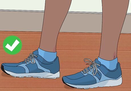 Choose well-fitting athletic shoes that keep your ankles neutral. Wearing athletic shoes that keep your ankle in a neutral position—that is, not rotated inward, outward, forward, or backward—may make you less susceptible to ankle sprains. Consider shopping at a specialty shoe retailer where they can do a “gait analysis” and custom fit your shoes. Many people believe that high-top athletic shoes provide more ankle support and protection than low-tops, but there isn’t much evidence to prove this either. Consider it a matter of personal preference.