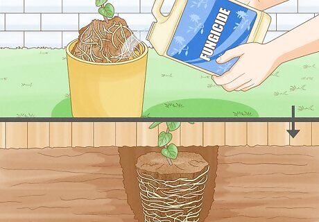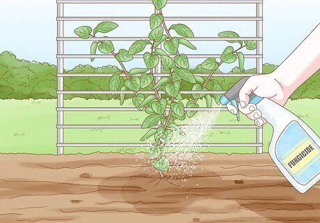 Keep using fungicide. As the clematis grows, continue to spray the fungicide around the zone of the roots. Once the plant appears well established, you can stop doing this.