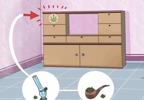 Place marijuana paraphernalia out of reach. If you have marijuana paraphernalia laying around your house, that could be a risk to your pet's health as well. Smoking apparatus such as bongs and pipes may contain a significant amount of marijuana. If somehow consumed, this could give your pet marijuana poisoning. For example, if you have a bong out in the open, your dog could decide to drink the water contained in it.