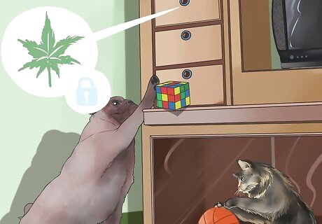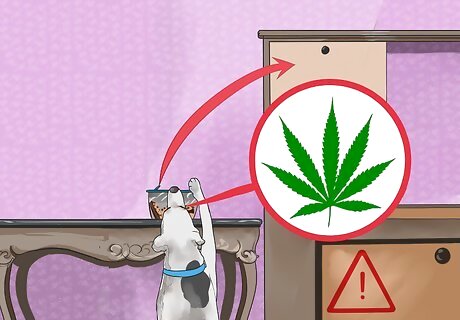 Place marijuana out of reach. In order to prevent your cat or dog from getting marijuana poisoning, you need to keep marijuana out of its reach. A pet can easily ingest marijuana that is accessible to it due simply to curiosity. Not only should it be kept in a sealed container but that container should be kept in an area that your pet cannot physically get to. A sealed container is not a guarantee that your pet will not become interested in your marijuana and ingest it. Many dogs, for instance, will investigate and chew on items that are new to them. If your dog gets its teeth on a container of marijuana, it could easily ingest a harmful amount. Dogs are much more likely to get marijuana poisoning than cats are. Because of this, you need to be especially adamant about keeping marijuana away from dogs.