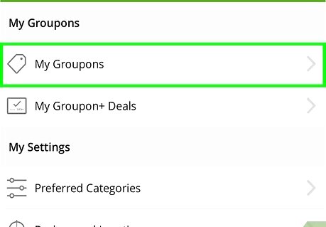 Tap My Groupons at the top. You can find this option listed next to a price tag icon at the top of the My Stuff menu.