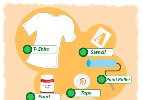 Gather supplies. To print on a t-shirt using a stencil, you only need a few basic supplies. You may have most of them around your house. If not, you'll find what you need at a craft or art store. Round up the following materials: A t-shirt. A plain, basic cotton t-shirt is fine. Know that some paints and inks will bleed through thin cotton, so if this is a concern for you, you might want to choose a thicker blend. The color you choose should be light enough (or dark enough) that the paint colors will show up well. A stencil. You can buy a pre-made stencil from a craft store or make your own using cardboard. Paint or ink. Acrylic fabric paint is a good choice for printing on t-shirts. You could also go with a fabric ink or stain. Look for a type that won't come out in the washing machine. A small paint roller and paint tray. You'll need this to apply the paint to the t-shirt evenly. If you don't have a roller, you can use a wide paintbrush. Tape. This is to hold the stencil in place while you apply the paint. Masking tape works well for this purpose.