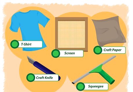 Prepare your work station. Cover a flat surface with butcher paper or scrap paper. Place the t-shirt on the surface and smooth out any folds or wrinkles. Put the paper stencil on the t-shirt where you want the design to be. Place the screen over the stencil.
