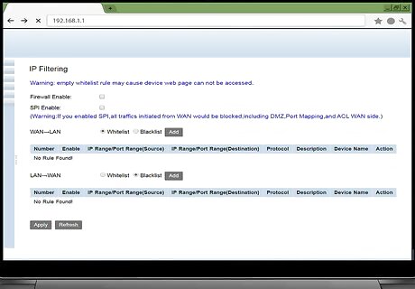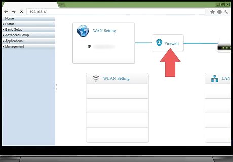 Find the "Firewall" section. Unlike other security options, you'll often find your router's "Firewall" section in its own part of the router page rather than on the Settings page. The easiest way to find this section is by opening your browser's "Find" feature (press Ctrl+F on Windows or ⌘ Command+F on Mac), typing in firewall, and scrolling through the results. For some routers, you may find the "Firewall" section on the Settings page. Your router may not have a firewall included. If you can't find a "Firewall" section, check your router's manual or online documentation to determine whether or not there is a firewall feature, and where it is if so.