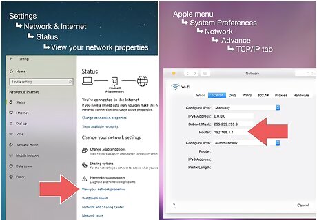 Find your router's address. Just like a webpage, you can access your router's page in your browser by entering the router's address into the URL bar. To find your router's address: Windows - Open Start Windows Start, click Settings Windows Settings, click Network & Internet, click Status, scroll down and click View your network properties, scroll down to the "Default gateway" heading, and review the numbered address to the right of the heading. Mac - Open the Apple menu Mac Apple, click System Preferences..., click Network, select your Wi-Fi network, click Advanced, click the TCP/IP tab, and review the numbered address to the right of the "Router" heading.